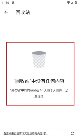 在回收站页面,能够查看回收站里是否存在内容,也能显示回收站中没有任何内容。