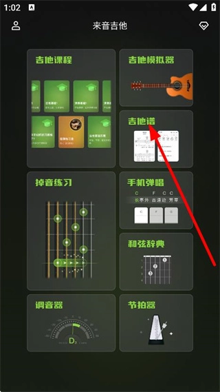 在来音吉他主界面,点击吉他谱,进入吉他谱页面。