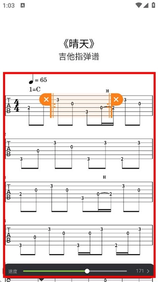 在吉他谱详情页面,你可以查看《晴天》的吉他指弹谱内容,同时还能对播放速度进行调节。