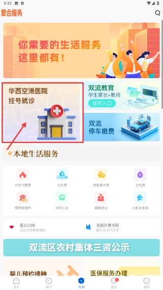 打开政务服务类应用,找到华西空港区医院的挂号就诊入口并点击,随后进入预约挂号页面。