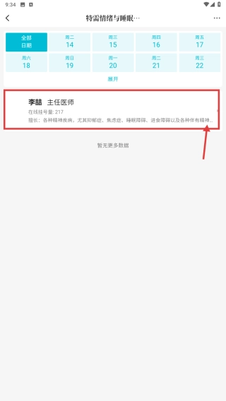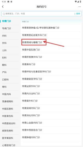 在预约挂号页面,选择特需情绪与睡眠门诊分类,进入门诊详情页。