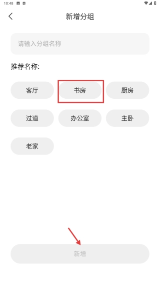 在新建分组的界面里,从推荐的名称列表中挑选“书房”这个选项,以此来确认该分组的名称。