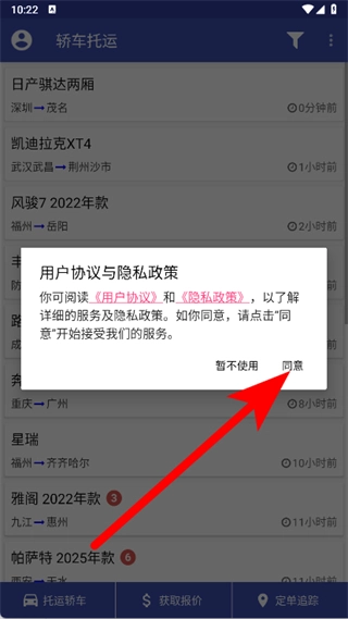 打开轿车托运,在弹窗中点击同意。