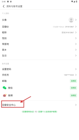 在账号管理页面,点击豆瓣安全中心选项,进入安全中心界面。