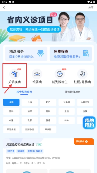 在项目列表里,找到并点击关节疾病相关项目,即可进入骨关节炎与运动损伤义诊的详情页面。
