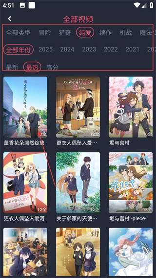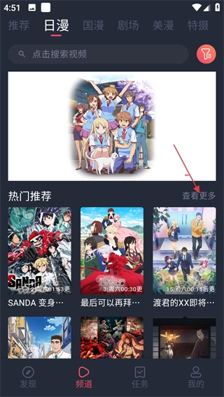 在日漫分类页面,点击热门推荐旁边的“查看更多”按钮,就能进入全部视频页面。