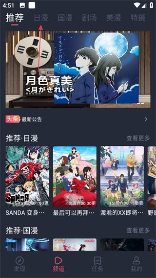 进入软件,点击顶部日漫标签,进入日漫分类页面。