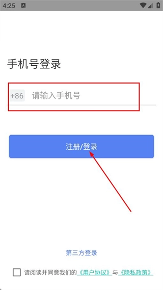 在手机号登录界面,填写手机号码后点击注册/登录按钮,即可完成登录步骤。