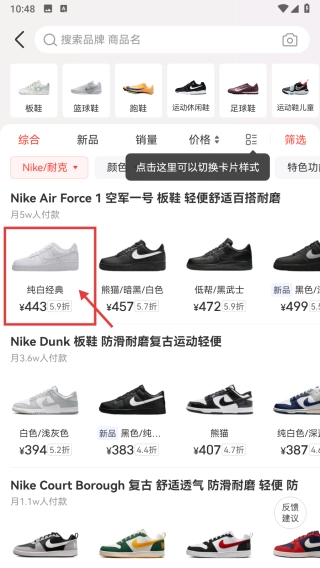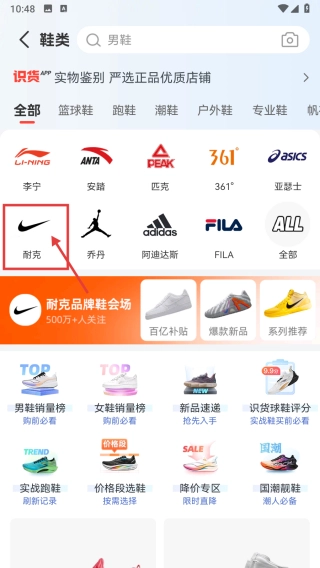在鞋类商品页面,点击耐克品牌选项,即可进入耐克品牌鞋类页面。