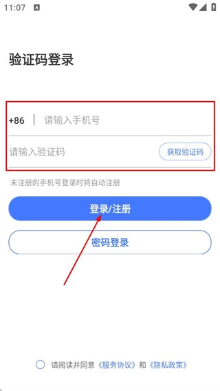 在登录页面填写手机号,获取并输入验证码,勾选服务条款后,点击登录按钮即可完成账号登录流程。