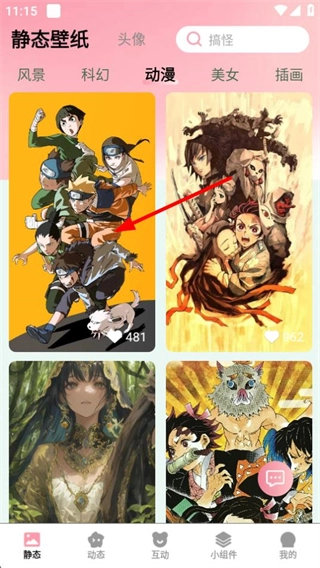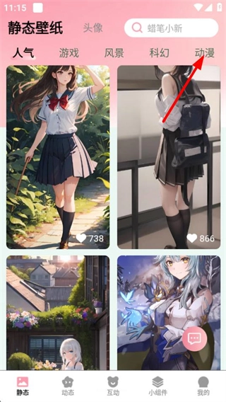 在静态壁纸页面,点击动漫分类标签,即可进入动漫类壁纸列表页面。