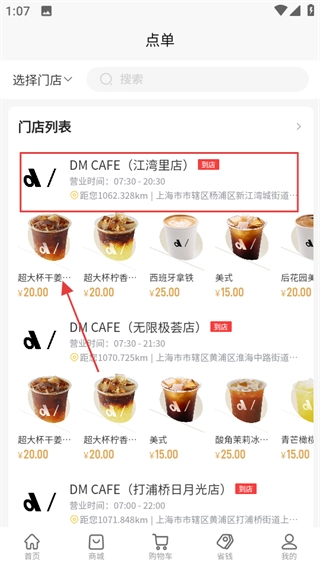 在DM CAFE的首页,找到并点击“到店取”选项,即可进入点单页面。
