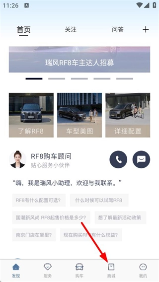 在江淮瑞风的首页,点击页面底部的商城选项,即可进入商城页面。