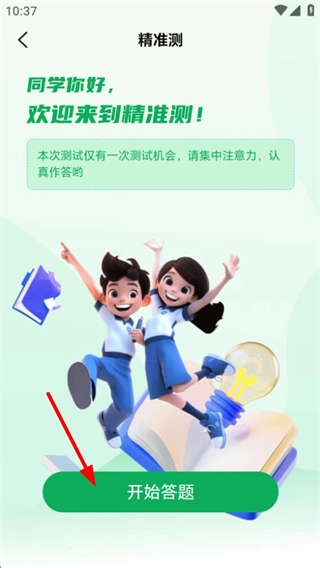 在精准测试的准备页面,点击“开始答题”按钮,就能进入测试答题界面。