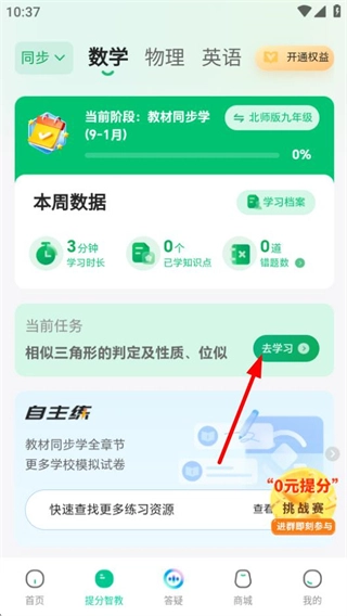 进入提分管教页面后,点击当前任务旁边的“去学习”按钮,就能进入相应的学习模块。