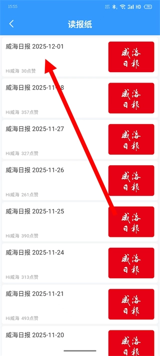 在报纸阅读页面,找到并选择对应日期的威海日报,随后进入其详情页面。