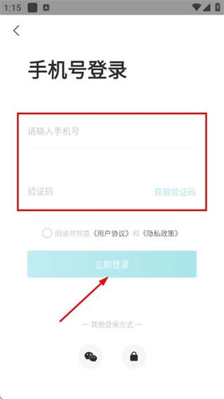 在登录界面输入手机号与验证码,勾选相关协议后,点击登录按钮即可完成账号登录流程。