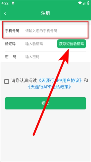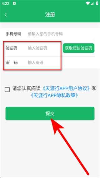在输入框里填写验证码,设置好密码并勾选相关协议,接着点击提交按钮,就能完成注册流程。