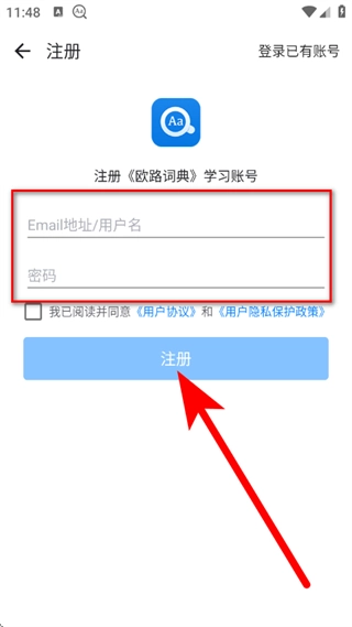 在注册页面填写用户名与密码,勾选相关协议后点击注册按钮,即可完成账号的创建流程。