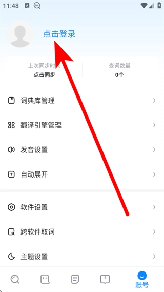 打开欧路词典应用后,在主界面找到底部的账号按钮并点击,即可进入账号页面。