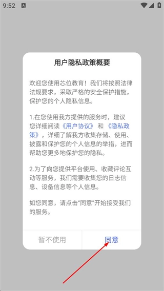 在芯位教育的用户隐私政策概要弹窗里,点击同意按钮,即可进入首页。
