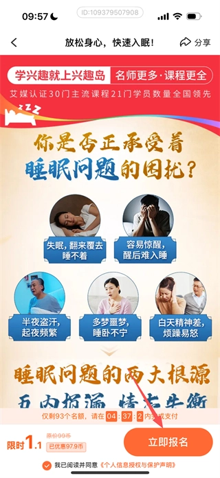 在课程详情页面,勾选相关协议后点击“立即报名”按钮,就能完成课程报名。