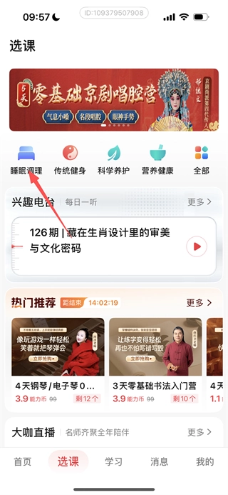 在选课页面,点击睡眠调理分类,进入对应的选课中心页面。