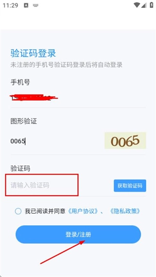 在手机验证登录界面输入手机号码、图片验证码,勾选相关协议后,点击“获取验证码”按钮。