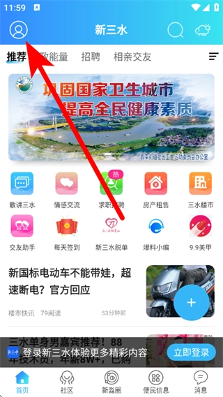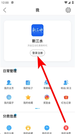 打开新三水应用后,点击界面左上角的个人图标,即可进入“我的”页面。