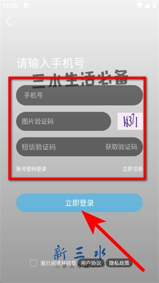 输入手机号码与图片验证码,再填写验证码,勾选相关协议后点击立即登录按钮,即可完成登录流程。