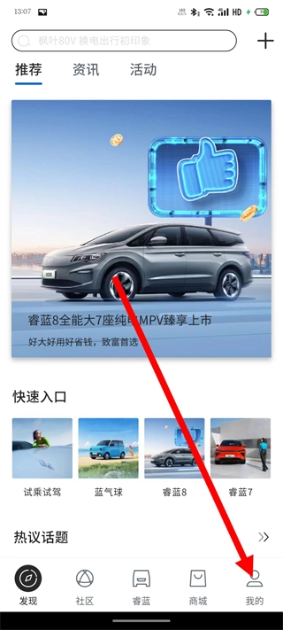 打开睿蓝汽车,点击底部的我的,进入我的页面。