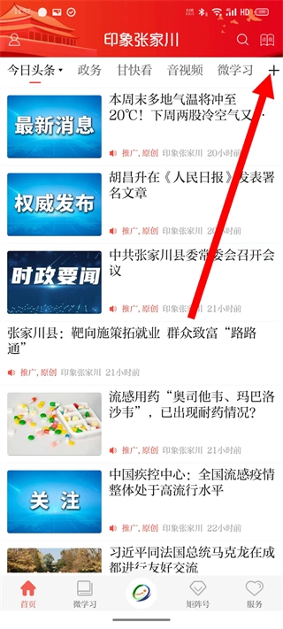 打开印象张家川,点击顶部导航栏的加号按钮,即可进入所有栏目界面。