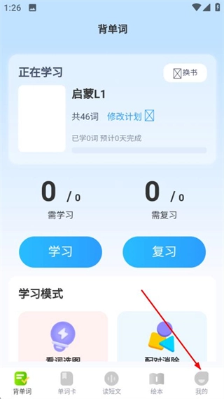 在乐喵单词的首页,点击底部的“我的”选项,就能进入登录选择页面。