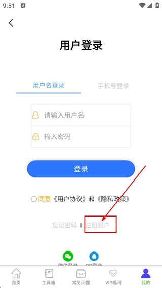 在用户登录页面,点击下方的注册账户选项,进入用户注册页面。