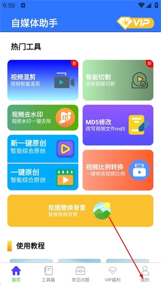 在自媒体助手的首页,点击页面底部的“我的”选项,即可进入个人中心页面。