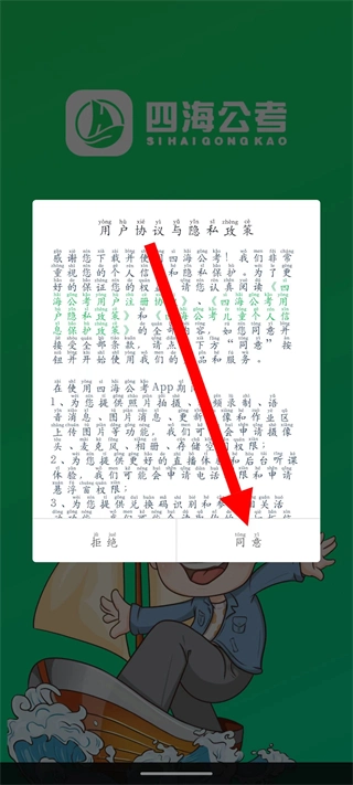 打开四海公考后,当弹出用户协议与隐私政策的窗口时,点击同意按钮。