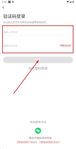 在登录界面输入手机号与验证码,勾选相关协议后,点击登录按钮即可完成账号登录流程。