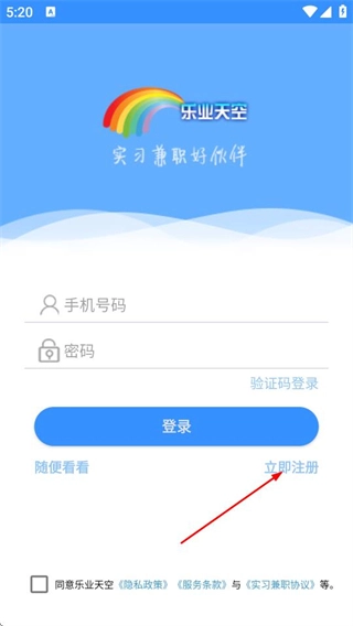 在乐业天空的登录页面,先勾选同意相关条款,接着点击“立即注册”按钮,即可进入注册页面。