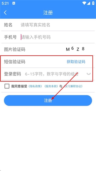 在注册页面,先点击“获取验证码”,接着填写收到的短信验证码,然后设置登录密码,最后点击注册按钮,即可完成账号注册。