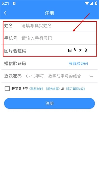 在注册页面,需填写姓名与手机号,同时输入对应的图片验证码,之后再开展下一步操作。