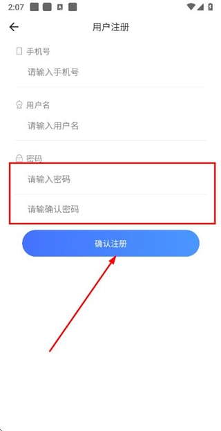 用户在注册页面填写密码后,点击确认注册按钮即可完成注册流程。
