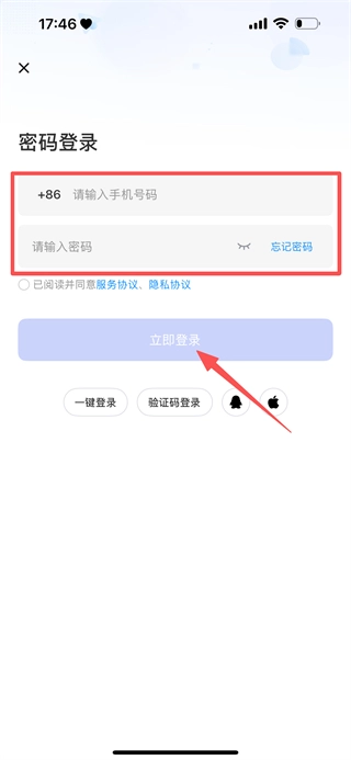 在密码登录页面,输入手机号码与密码后点击登录按钮,即可完成账号登录操作。