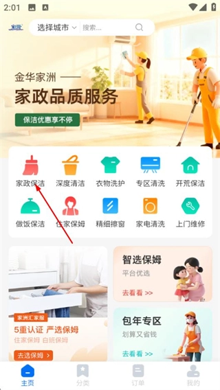 在家洲首页,点击家政保洁选项,进入钟点保姆服务页面。