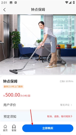 在钟点保姆的页面上,点击“立即购买”按钮,就能进入服务规格的选择窗口。