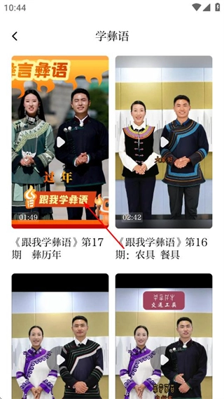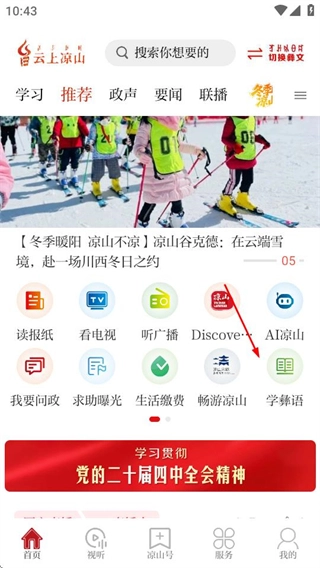 在云上凉山首页找到“学彝语”选项并点击,即可进入学彝语的内容页面。