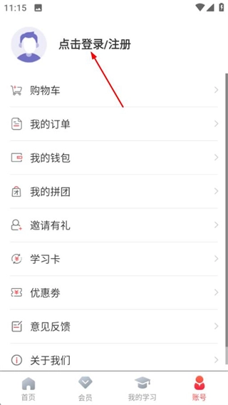在账号页面,点击点击登录注册按钮进入登录界面。