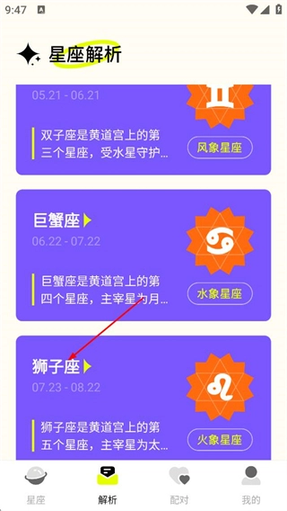 在星座解析页面,点击对应的星座,即可查看该星座的详细解析内容。