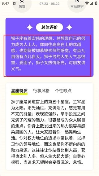在星座详情页面,我们就能看到总体评价以及星座特质等板块的内容。