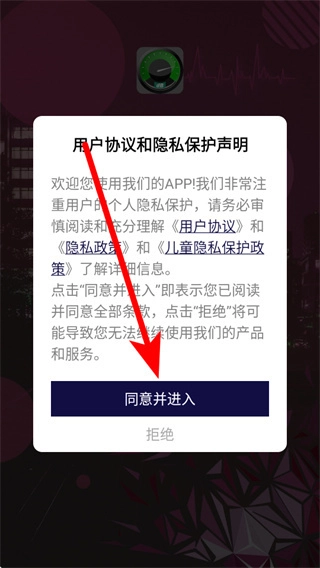 打开分贝测量仪应用后,会弹出一个弹窗,点击“同意并进入”按钮,即可进入主界面。