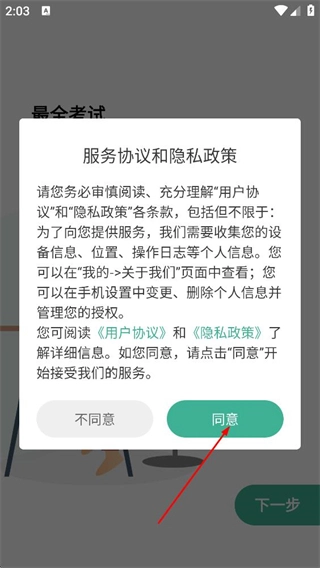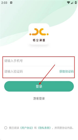 阅读用户协议与隐私政策后,点击同意按钮,即可进入悟空刷题的主界面。